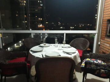 Sacada gourmet com churrasqueira e vista para o mar, serra e rio