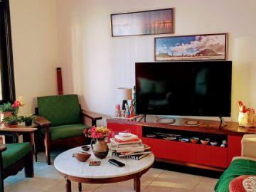Quarto com sofá-cama, home office e toca-discos com vinis